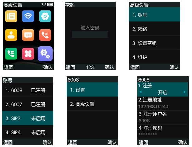 2.選擇注冊線路>設置>開啟注冊,填寫語音主機IP地址,填寫注冊用戶名,注冊密碼(SIP分機用戶、密碼由語音主機提供帳號密碼),填寫注冊端口(由語音主機提供),最后確認,完成話機注冊。