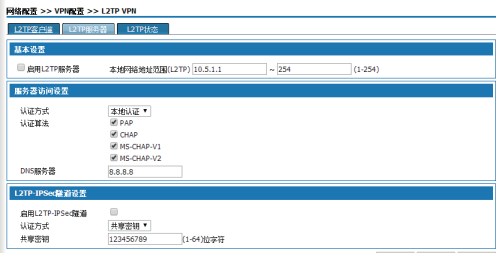 認證方式:目前只支持“本地認證”方式; 認證算法:本地認證提供“PAP”、“CHAP”、“MS- CHAP-V1”、“MS-CHAP-V2”四種認證算法。選中單選框,選擇對應的算法。客戶端連接L2TP服務器時,選擇的認證算法必須與該認證算法一致。 DNS服務器:與運營商提供的保持一致 |