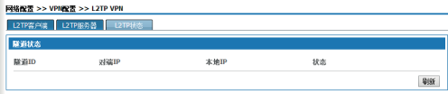 進行VPN連接操作后,單擊<L2TP狀態>標簽彈出如下圖所示。顯示建立VPN隧道自動分配的ID號、對端設備的IP地址、本設備的IP地址、連接狀態。