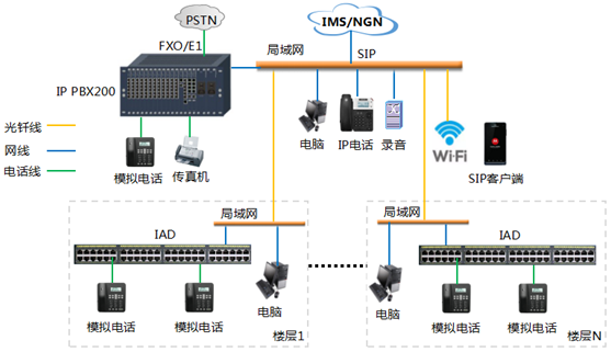 本方案適用于企業(yè)樓宇IP PBX應(yīng)用,IP PBX部署在樓宇機(jī)房中,各樓層模擬電話通過(guò)IAD接入,IAD與IPPBX之間通過(guò)企業(yè)內(nèi)網(wǎng)相連,IP用戶可使用普通IP電話機(jī)或手機(jī),電腦軟電話,上行通過(guò)FXO/E1接入PSTN網(wǎng)絡(luò)或者經(jīng)IP網(wǎng)絡(luò)接入IMS網(wǎng)絡(luò),為所有電話終端實(shí)現(xiàn)傳統(tǒng)語(yǔ)音服務(wù)。
